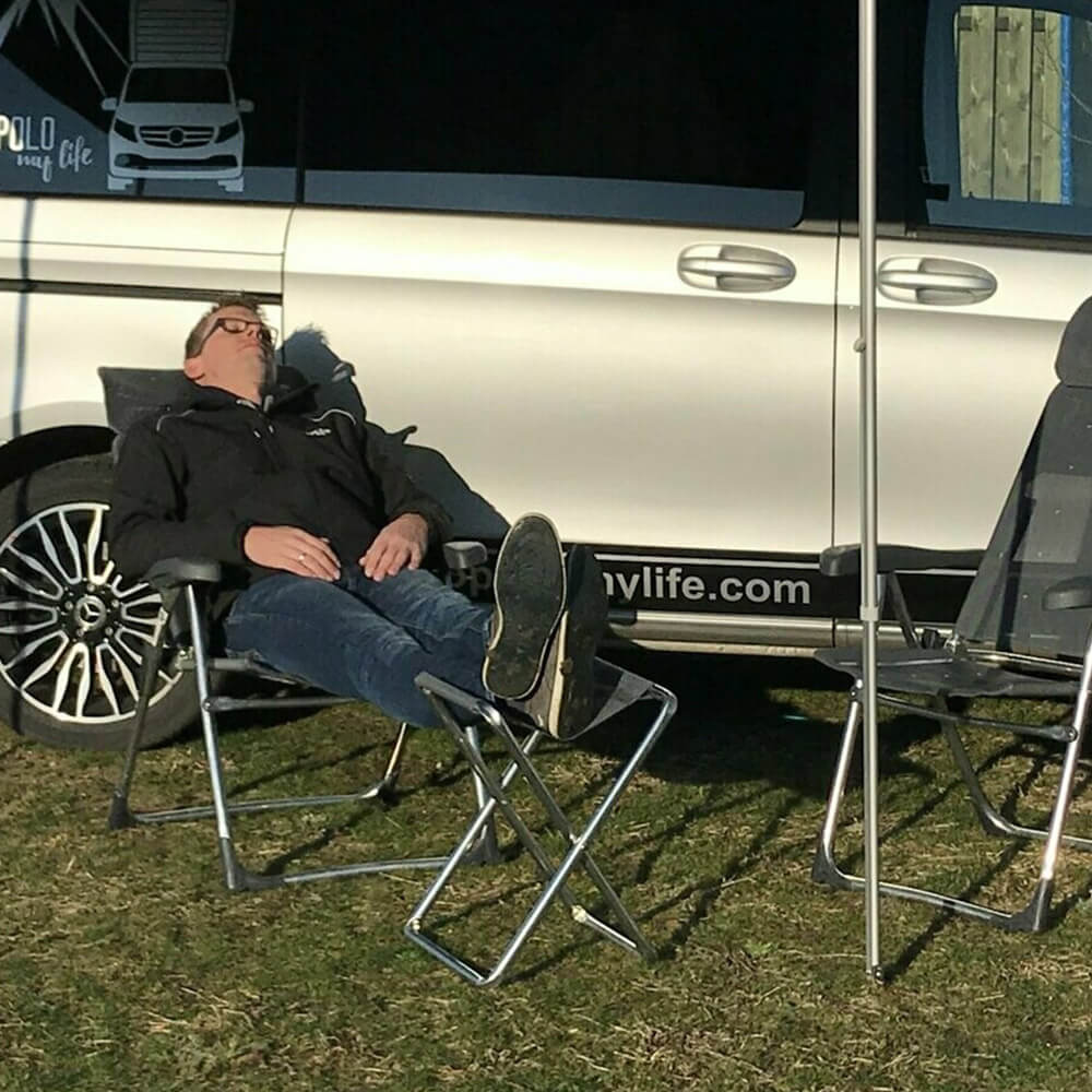 Der große Vorteil bei diesem Stuhl ist das zusammengeklappte Packmaß, er hat nur eine Tiefe von 5 cm und somit können 2 Stück perfekt zwischen der Rückbank und der Bettverlängerung verstaut werden!
