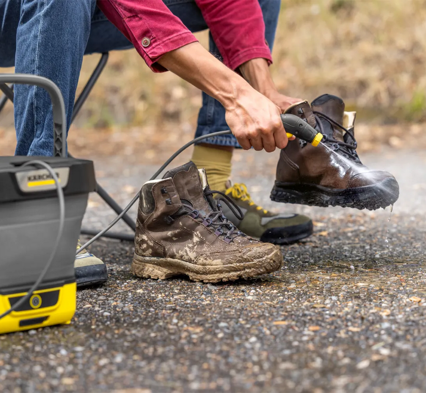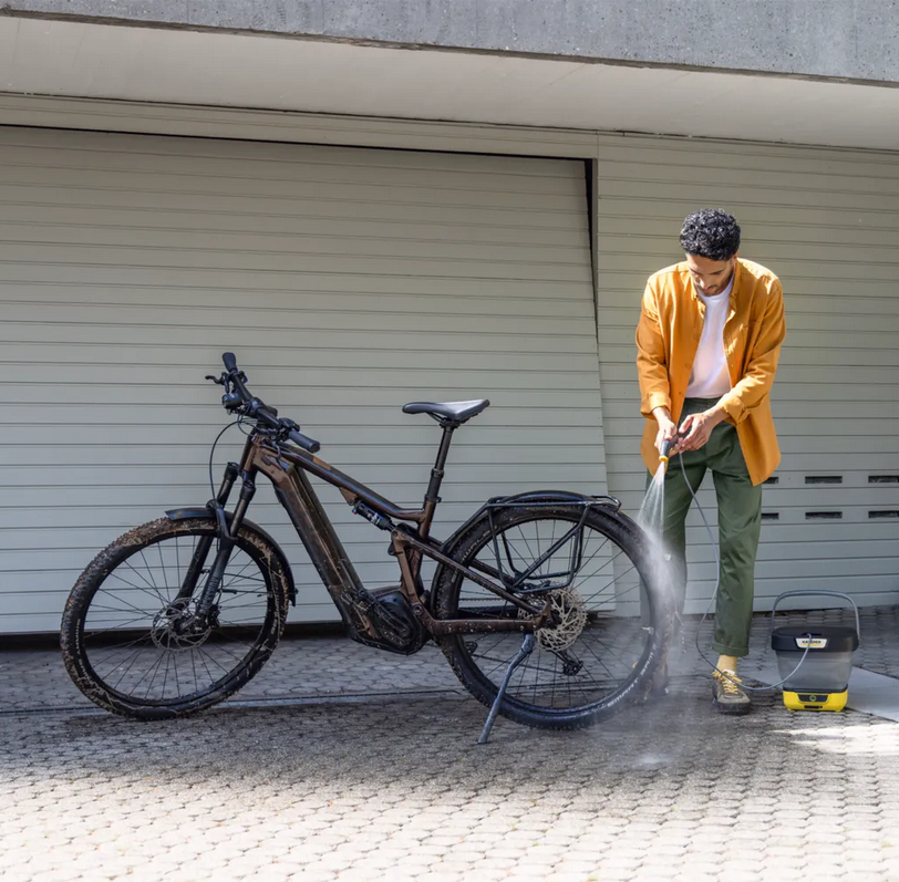 The flexible 1.8-metre pressure hose ensures optimum freedom of movement during cleaning. Whether at the campsite, after a bike ride or in your garden at home, the Mobile Outdoor Cleaner is the best solution for quick cleaning in between. A wide range of accessories is available to expand the range of applications.