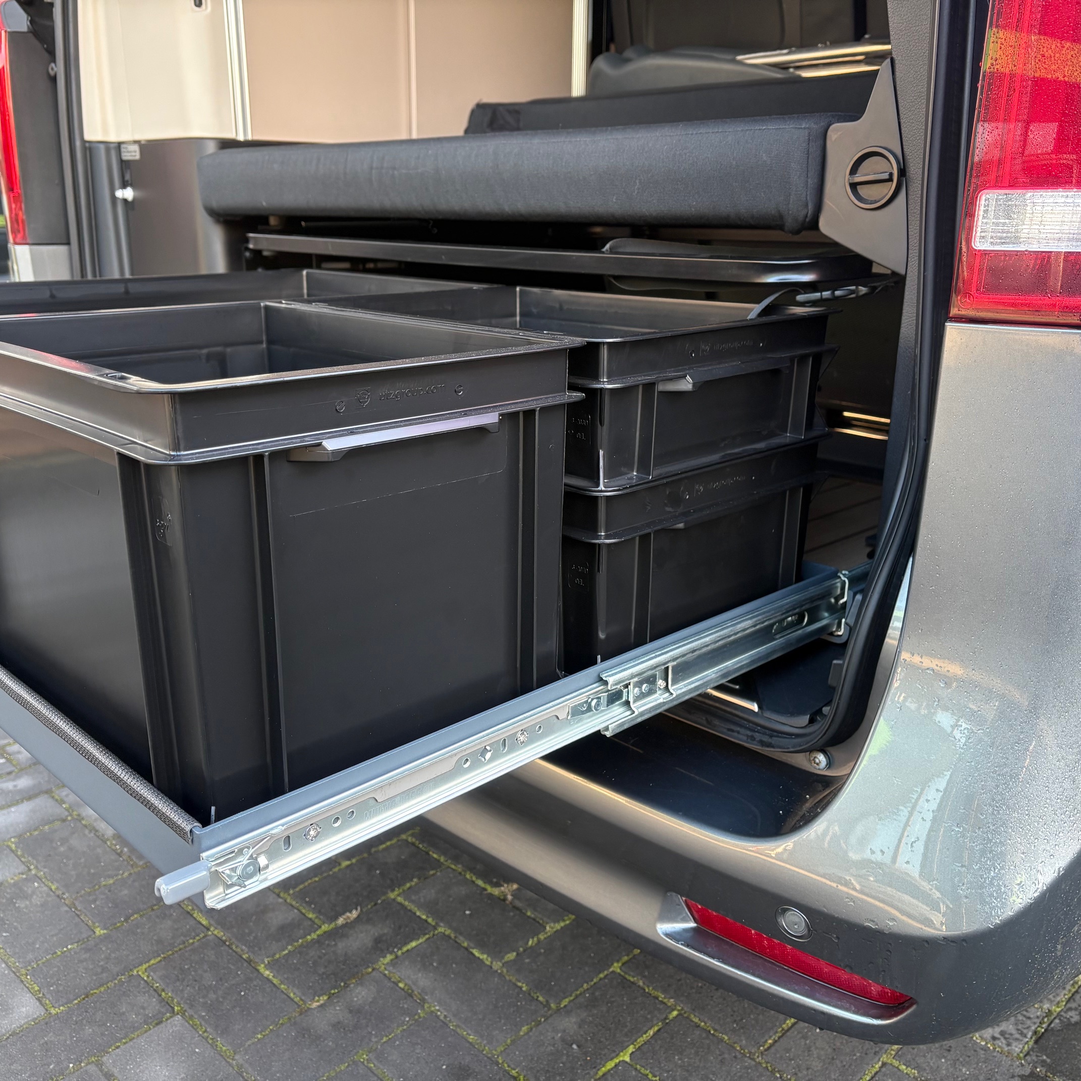 Der Auszug kann perfekt mit den standardisierten E-Kunststoffboxen verwendet werden.