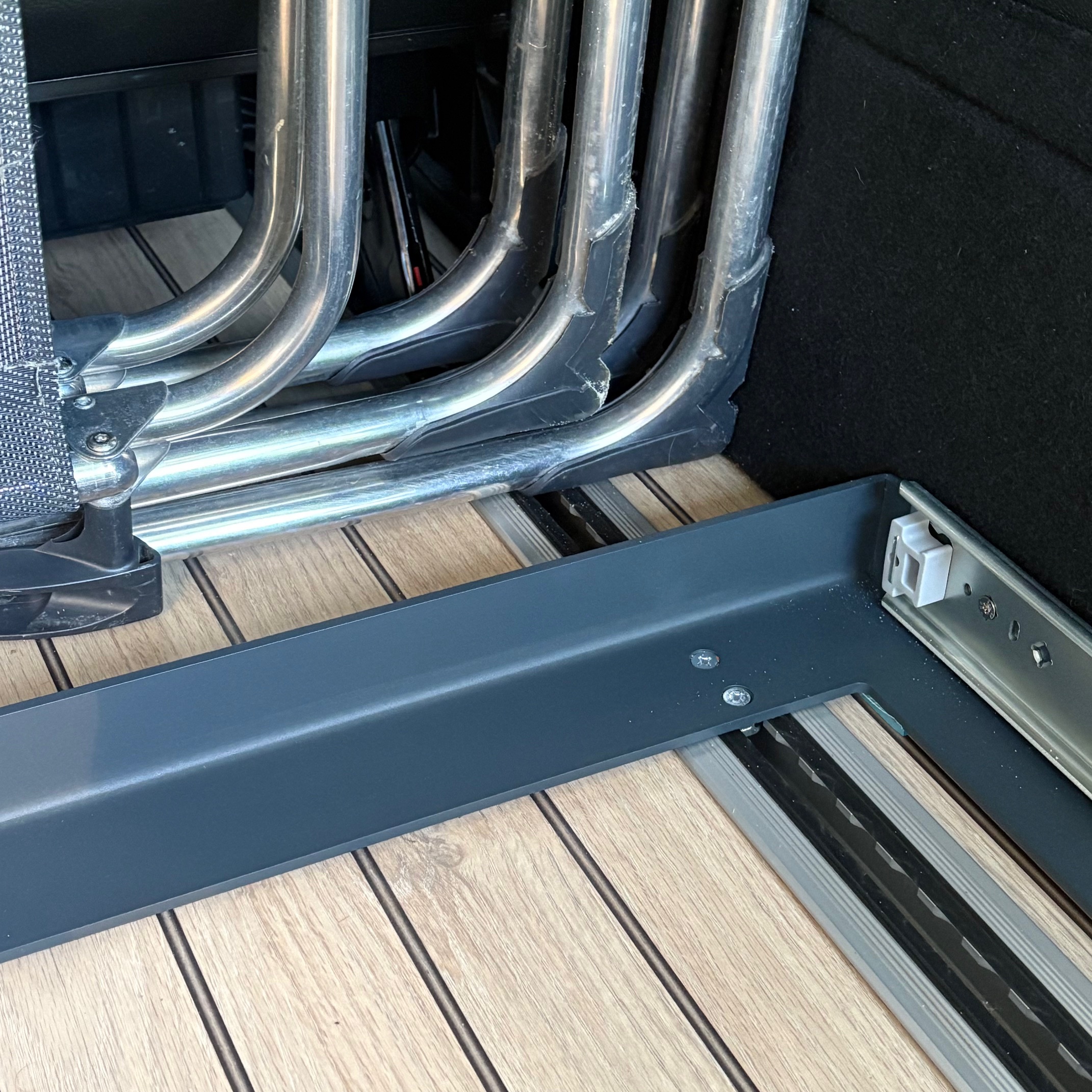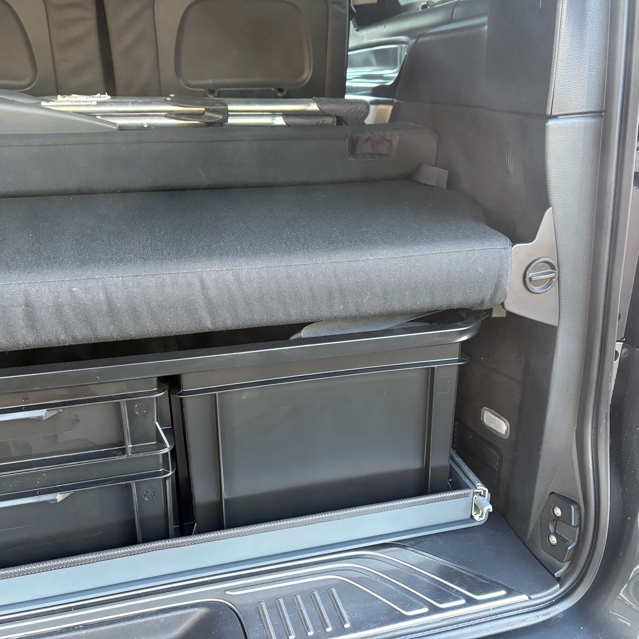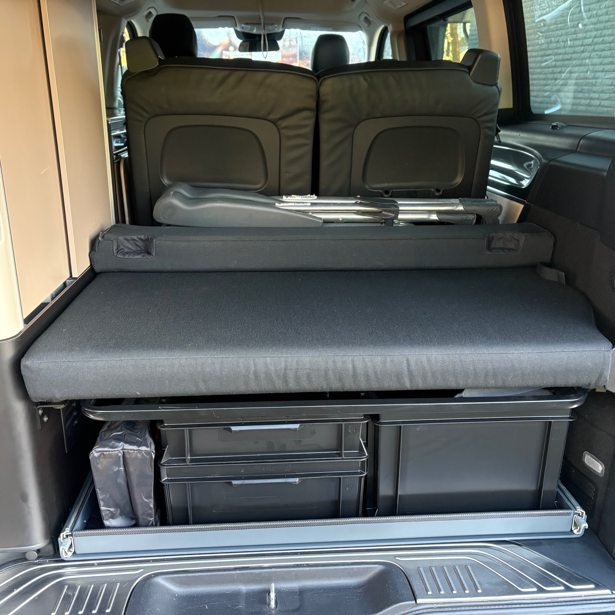 Der Vorteil dieser Version ist, dass die Rückbank komplett zurückgeschoben werden kann und die Campingstühle dann hochkant zwischen der Bettverlängerung und der Sitzbank verstaut werden können.