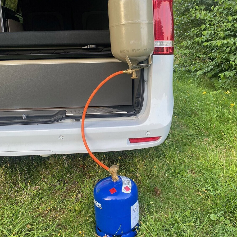 Im Prinzip können die Flaschen an jeder Tankstelle befüllt werden, aber Du kannst sie auch selbst mit einer 5 oder 11 kg Propangasflasche zu hause befüllen.